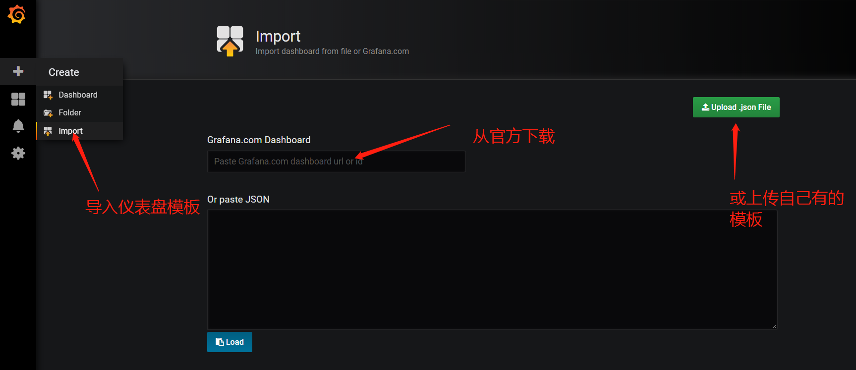 若已有仪表盘模板文件(json格式)或直接从官网下载的,可直接导入
